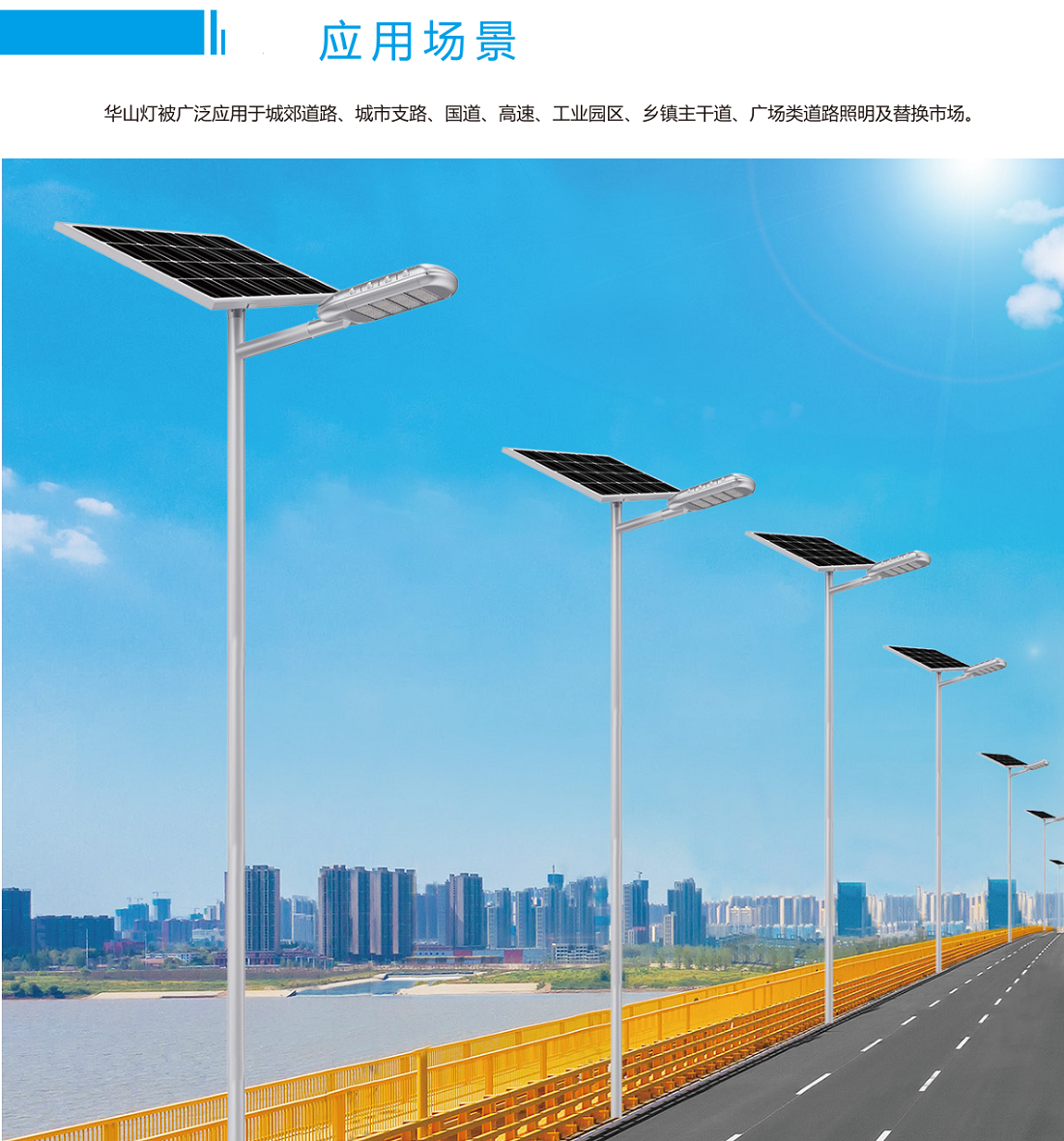 華山燈屬于高性價比的大功率分體式太陽能路燈,被廣泛應用于城市或鄉鎮主干道或次干道,以及高速路、工業園區、廣場等場景。