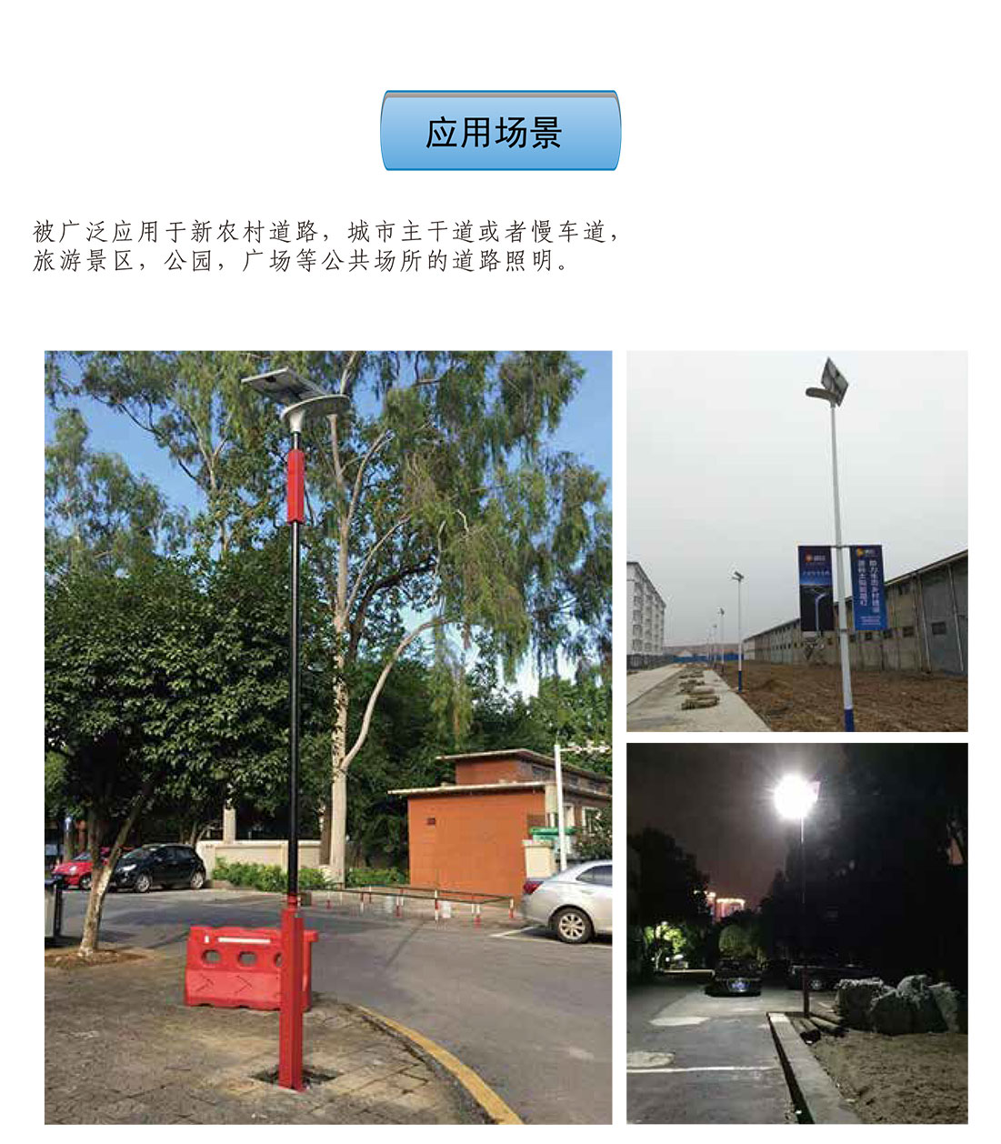飛鶴燈作為中高端太陽能智慧路燈,被廣泛應用于新農村道路、城市主干道或者慢車道、旅游景區、公園、廣場等場景。
